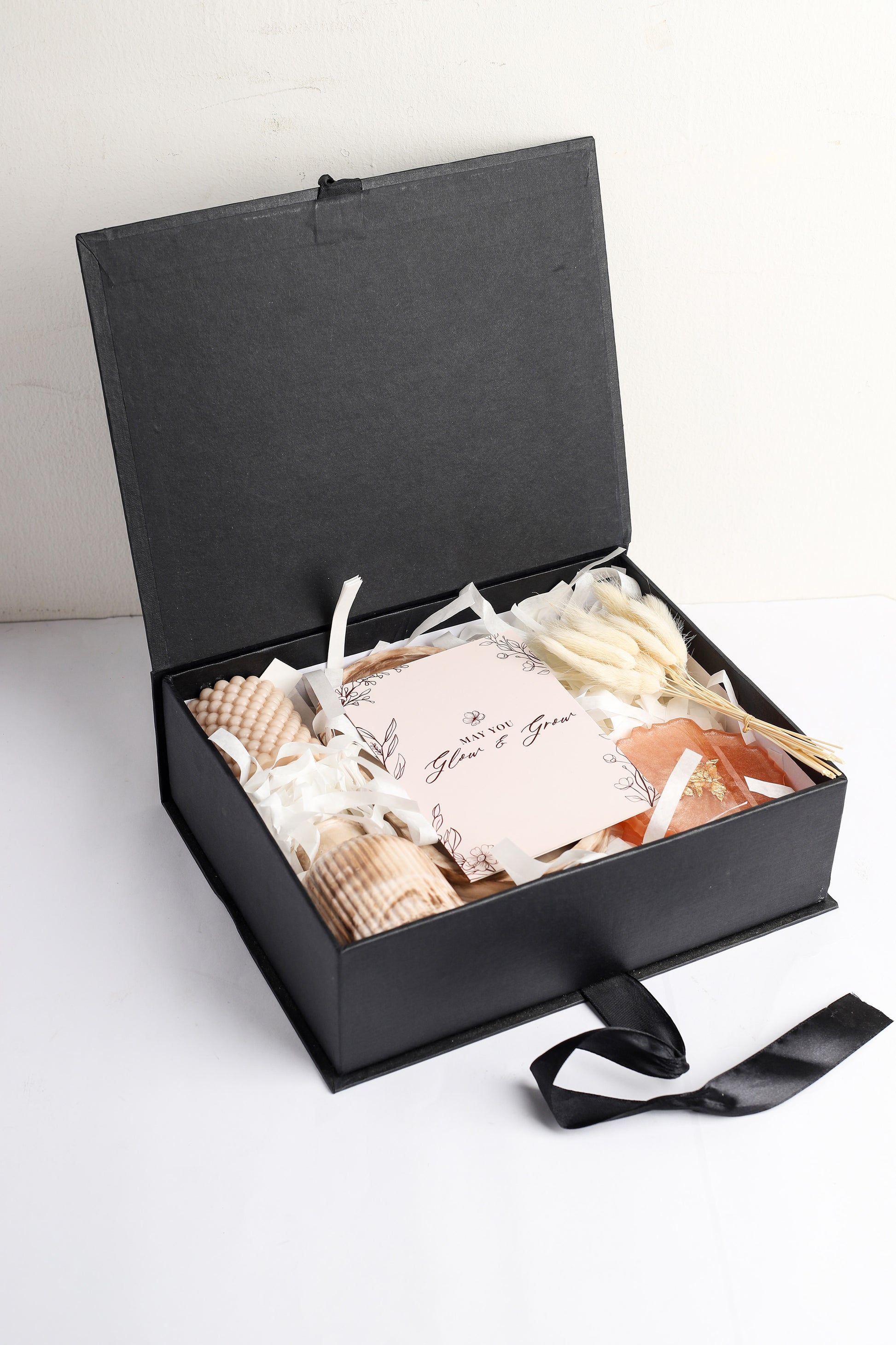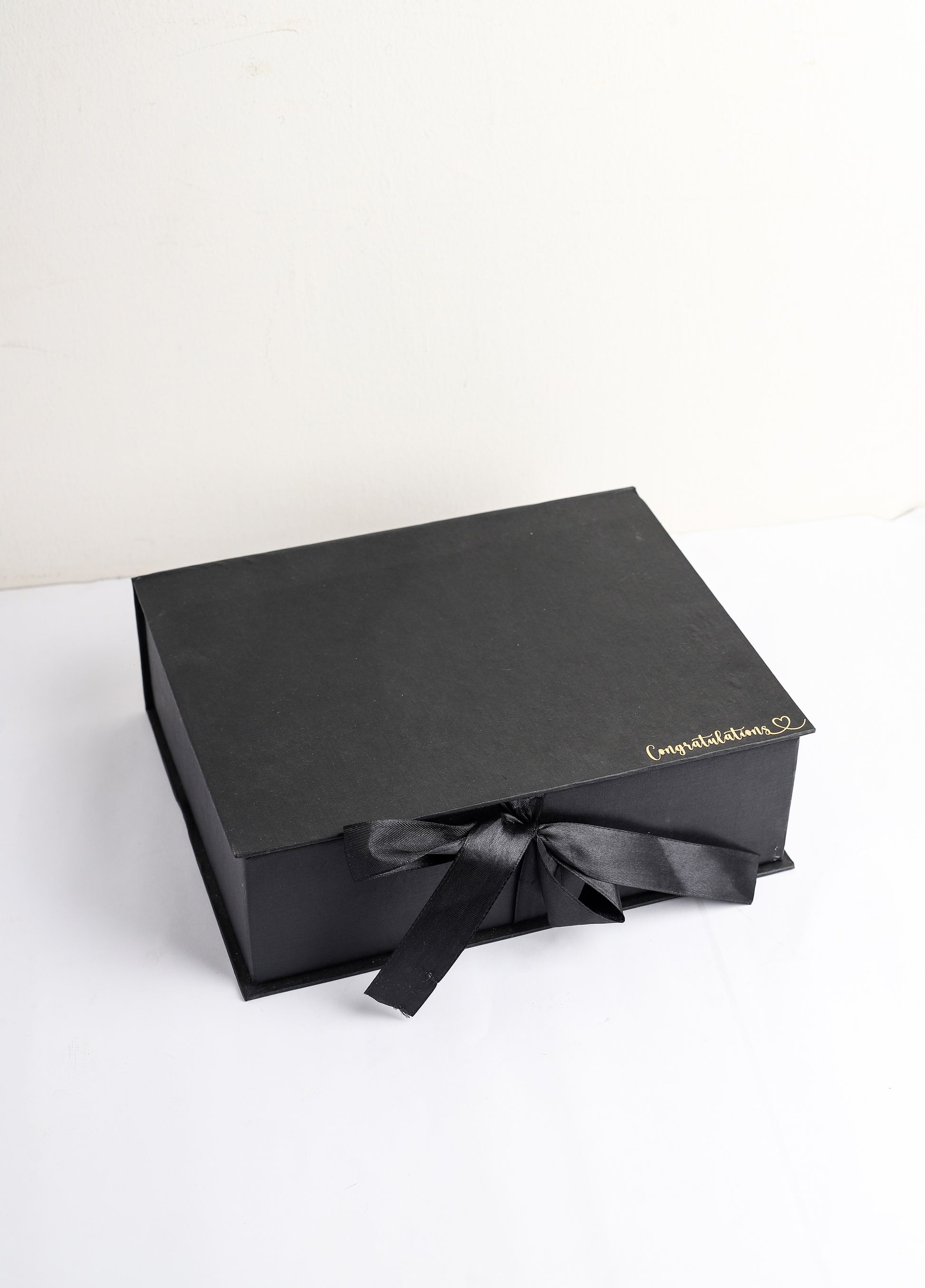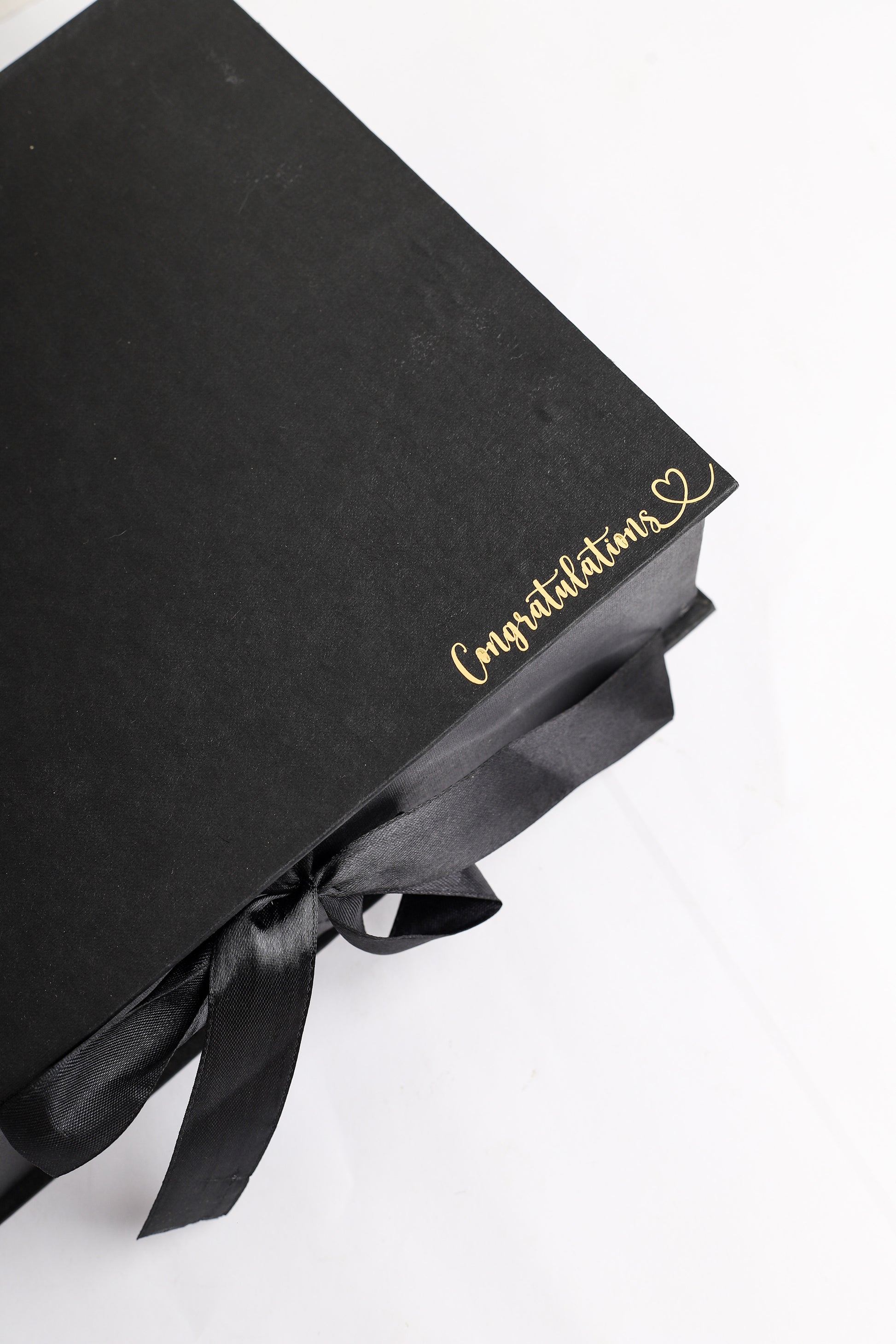 Elevate your gifting with our sleek black gift box, designed for a timeless and elegant presentation. Tied with a matching black ribbon, this sturdy box is perfect for creating a personalized gift set. You can even add a custom vinyl name or message for a special touch.