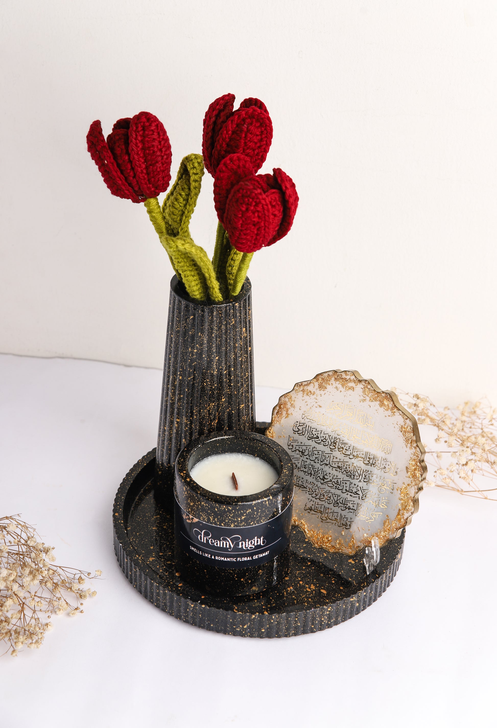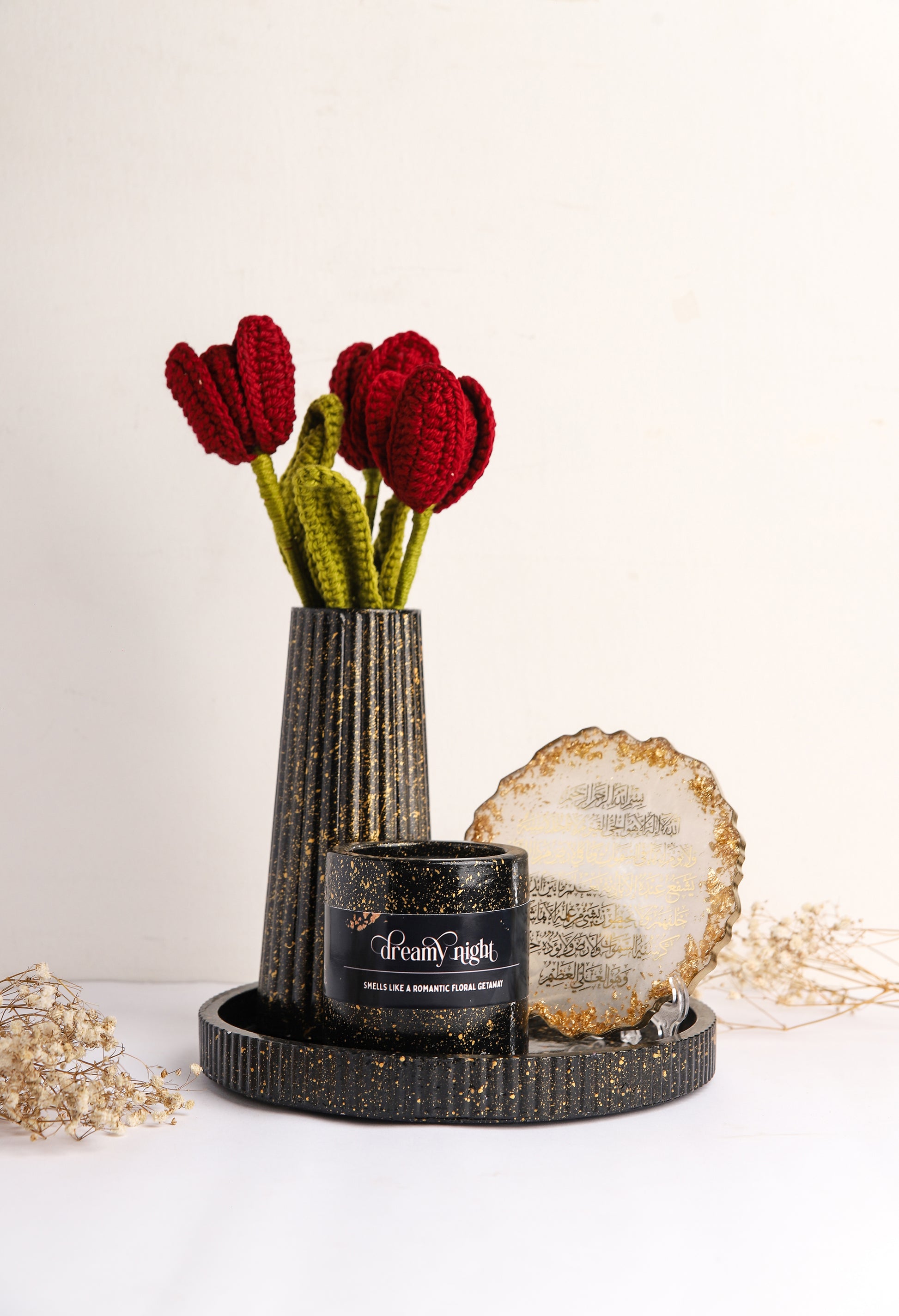 Our decor pieces (like trays and vases) are water-resistant but not fully sealed, so they’re best for dry use only. For vases, we recommend pairing them with our crochet flowers or pampas grass, not fresh florals.