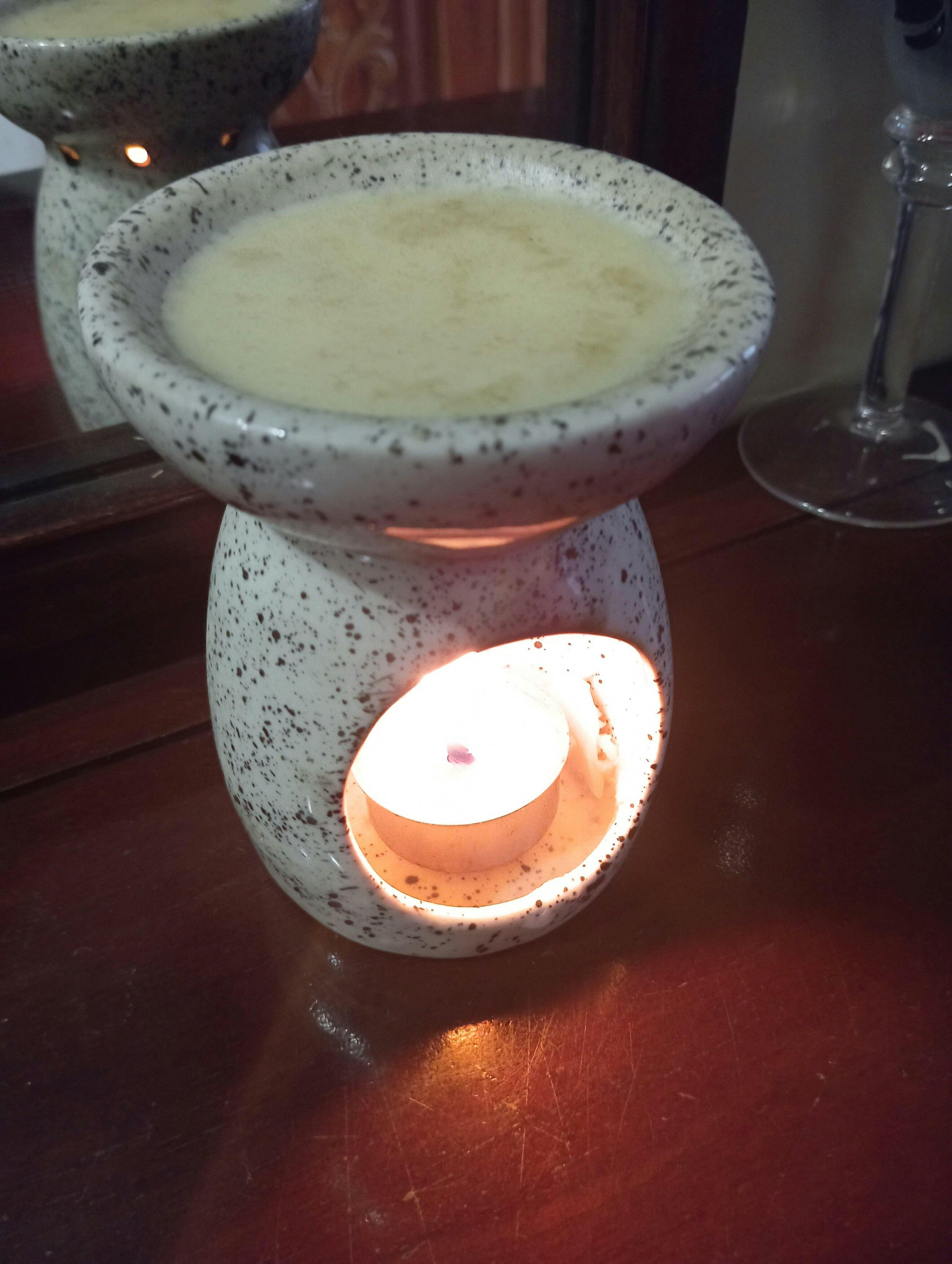 It’s a stylish, reusable wax melt burner made from ceramic. You place wax melts in the top bowl and light a tealight candle below to release fragrance.