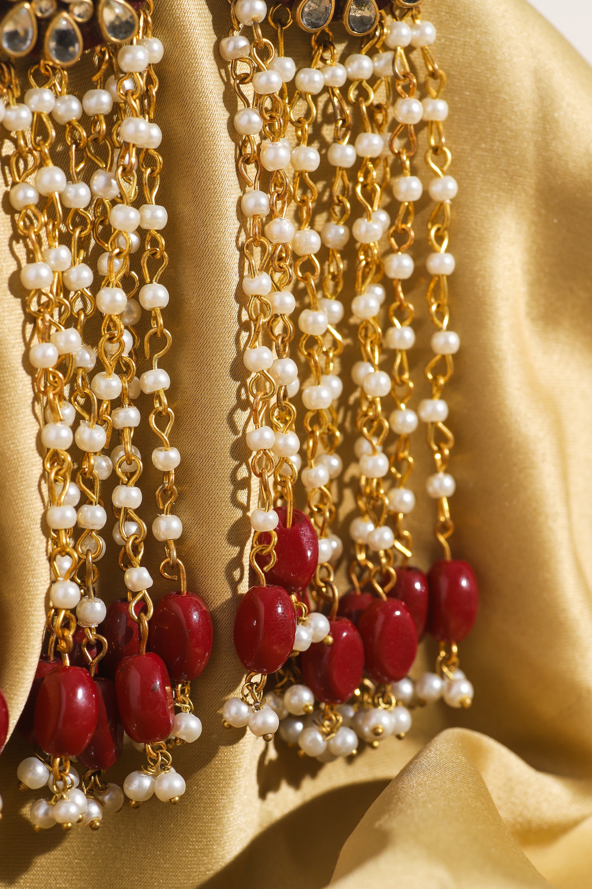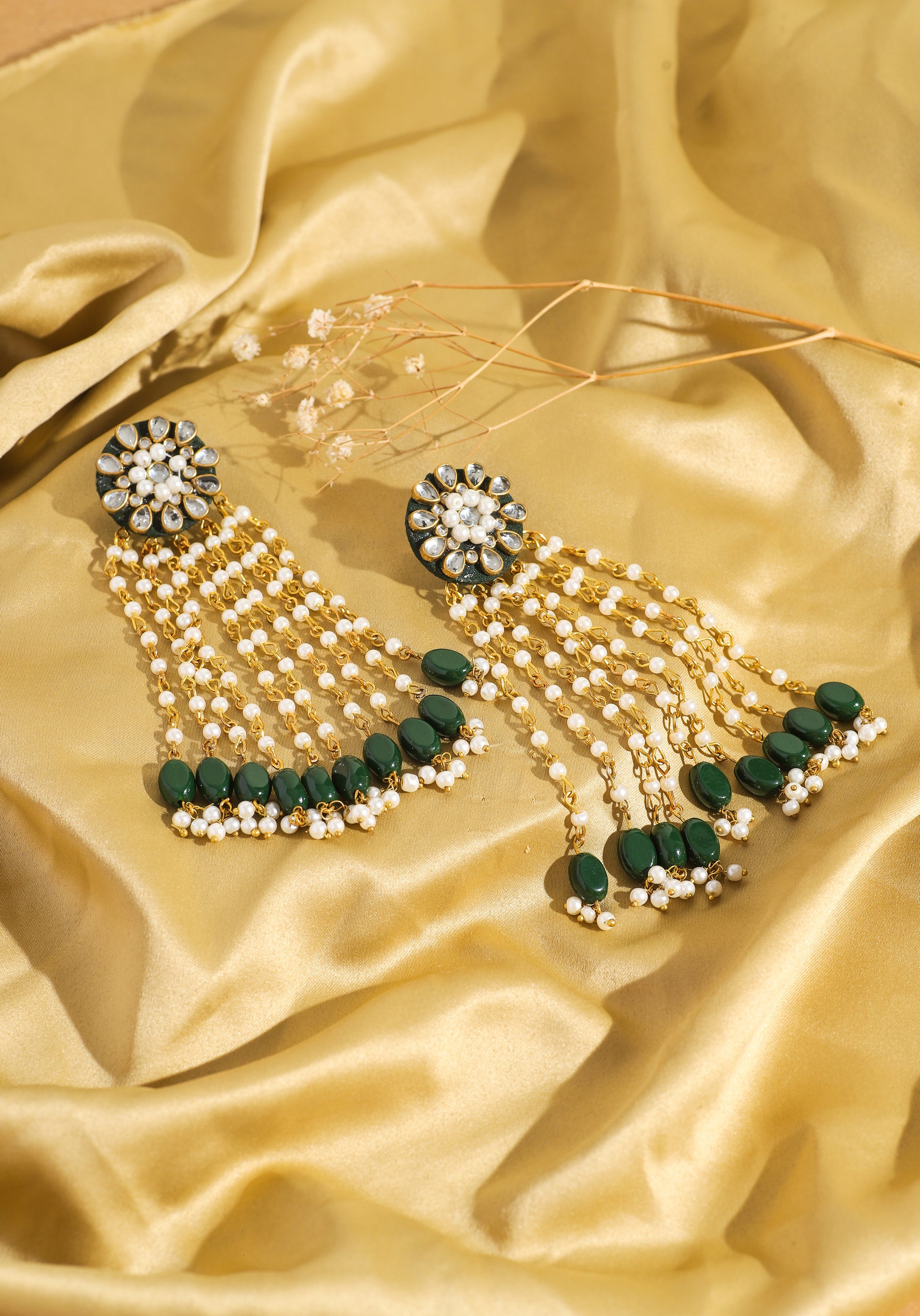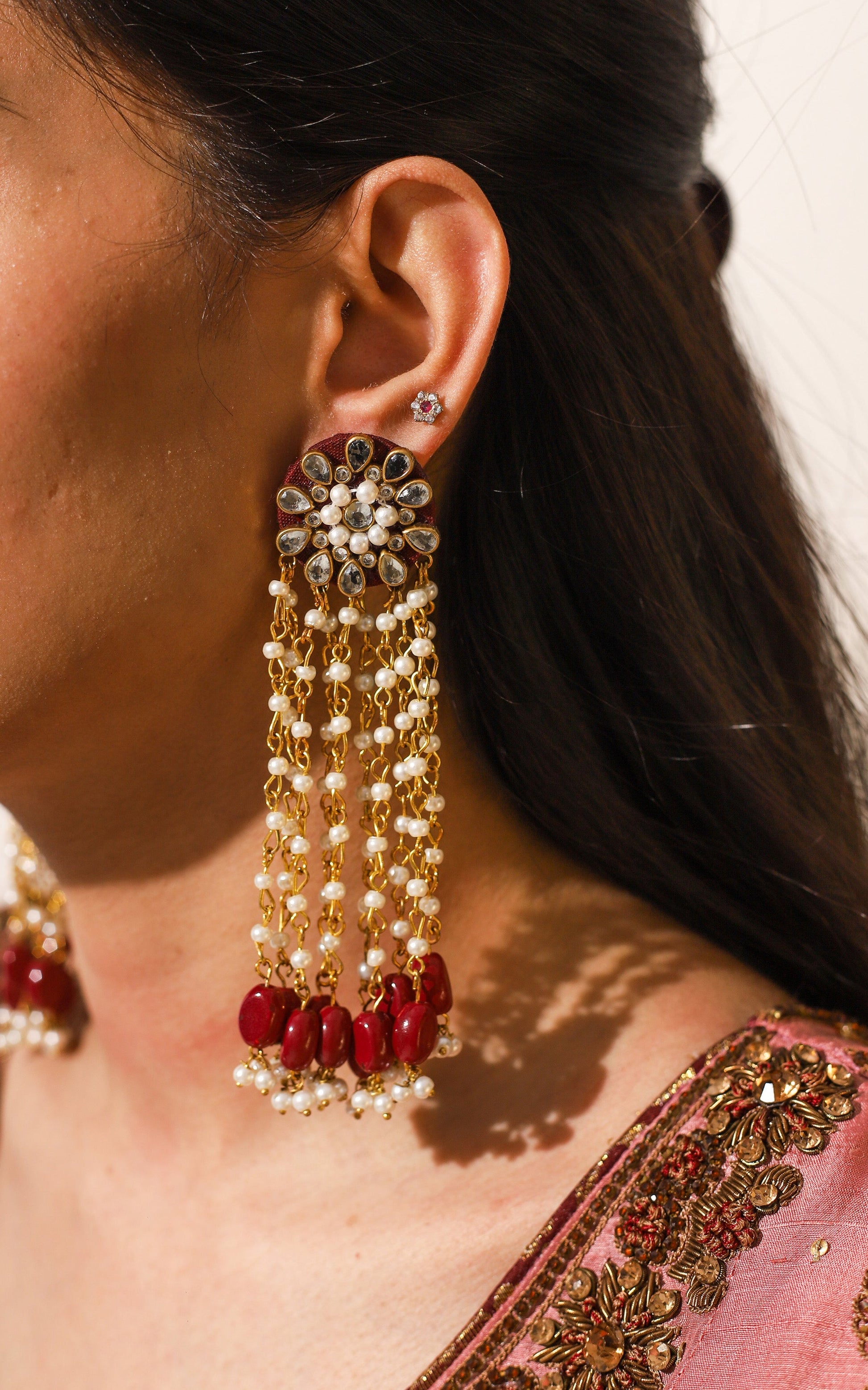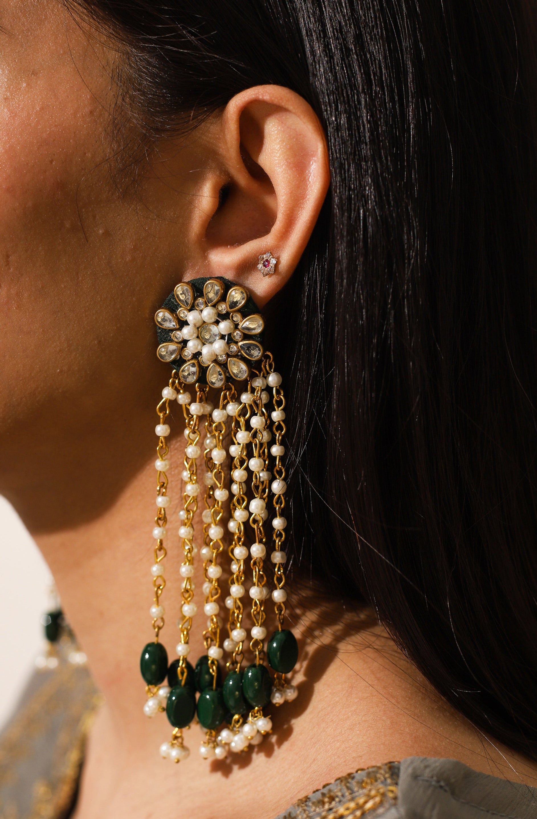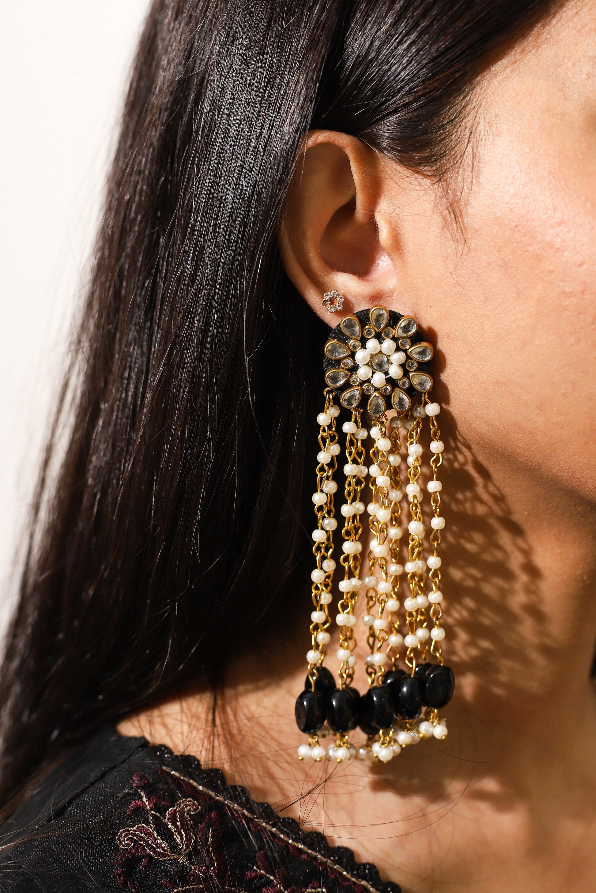 Inspired by Jahanara Begum, the Mughal princess known for her grace and love for the arts, these earrings embody elegance and timeless beauty. The touch of Kundan paired with long, flowing beads creates a regal, ethereal look, perfect for making a statement.