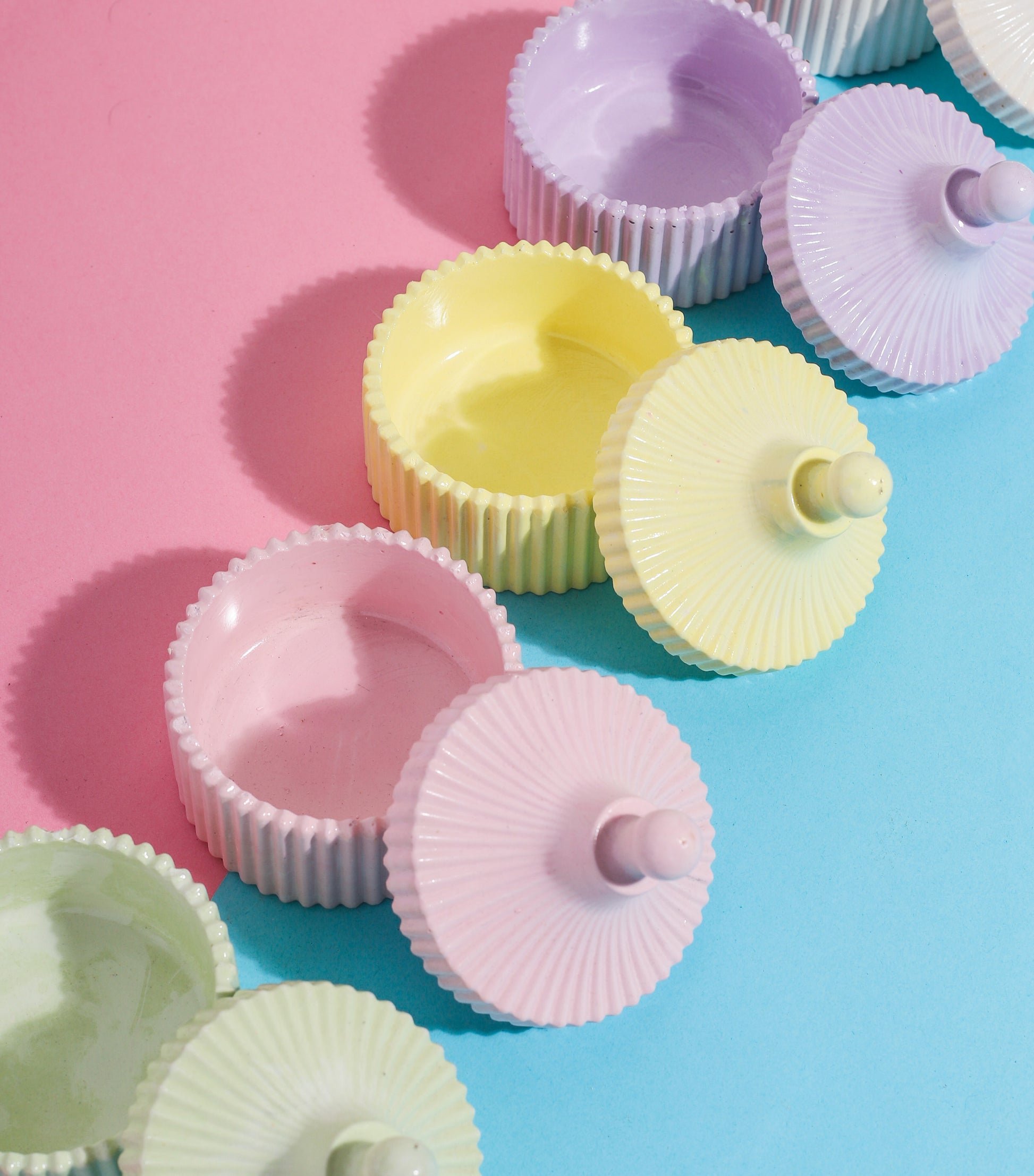 This striped circle container is perfect for storing jewelry, small essentials, or keepsakes. Its modern design and compact size make it a versatile decor piece for any space. The matching lid keeps everything secure while adding a chic touch.