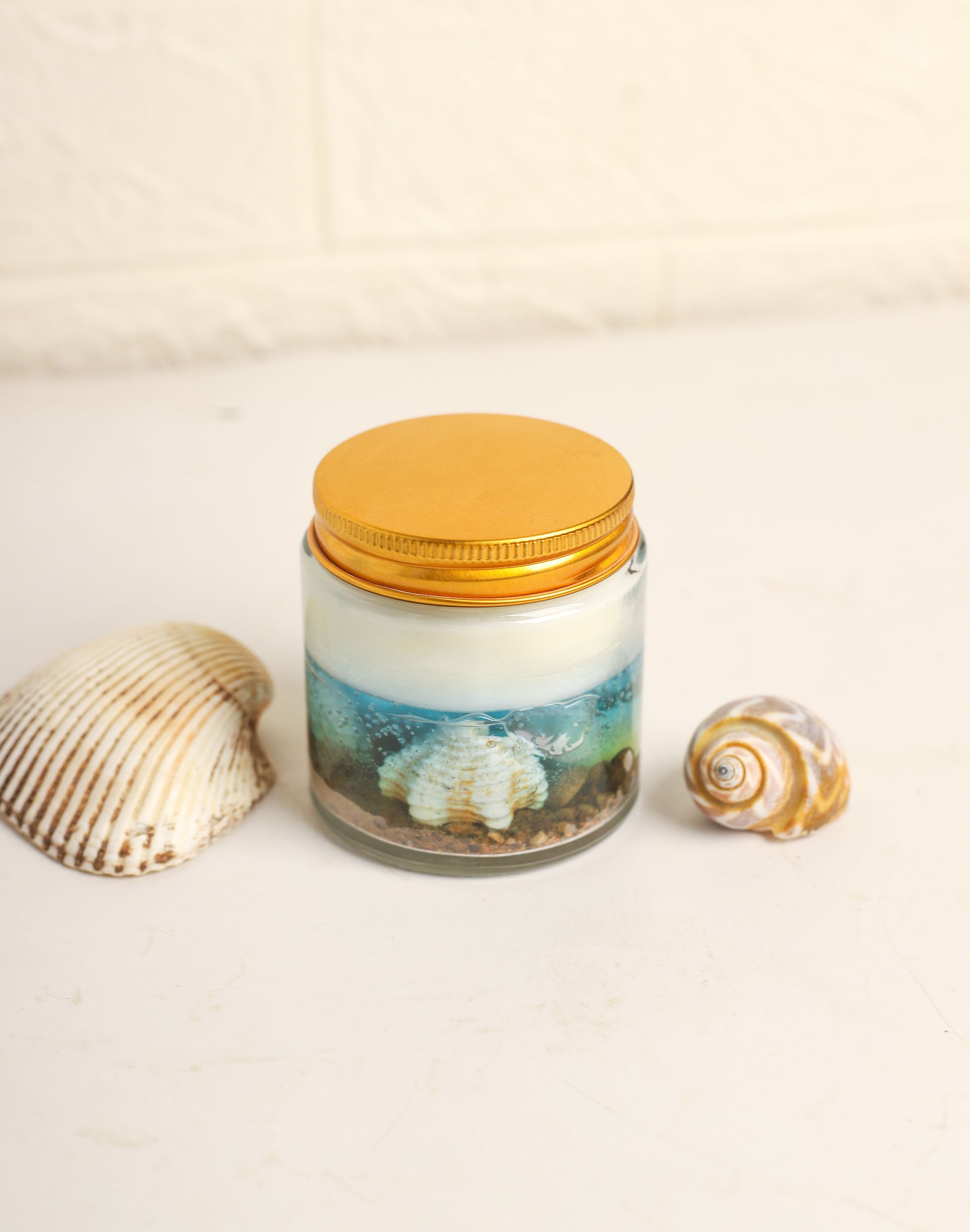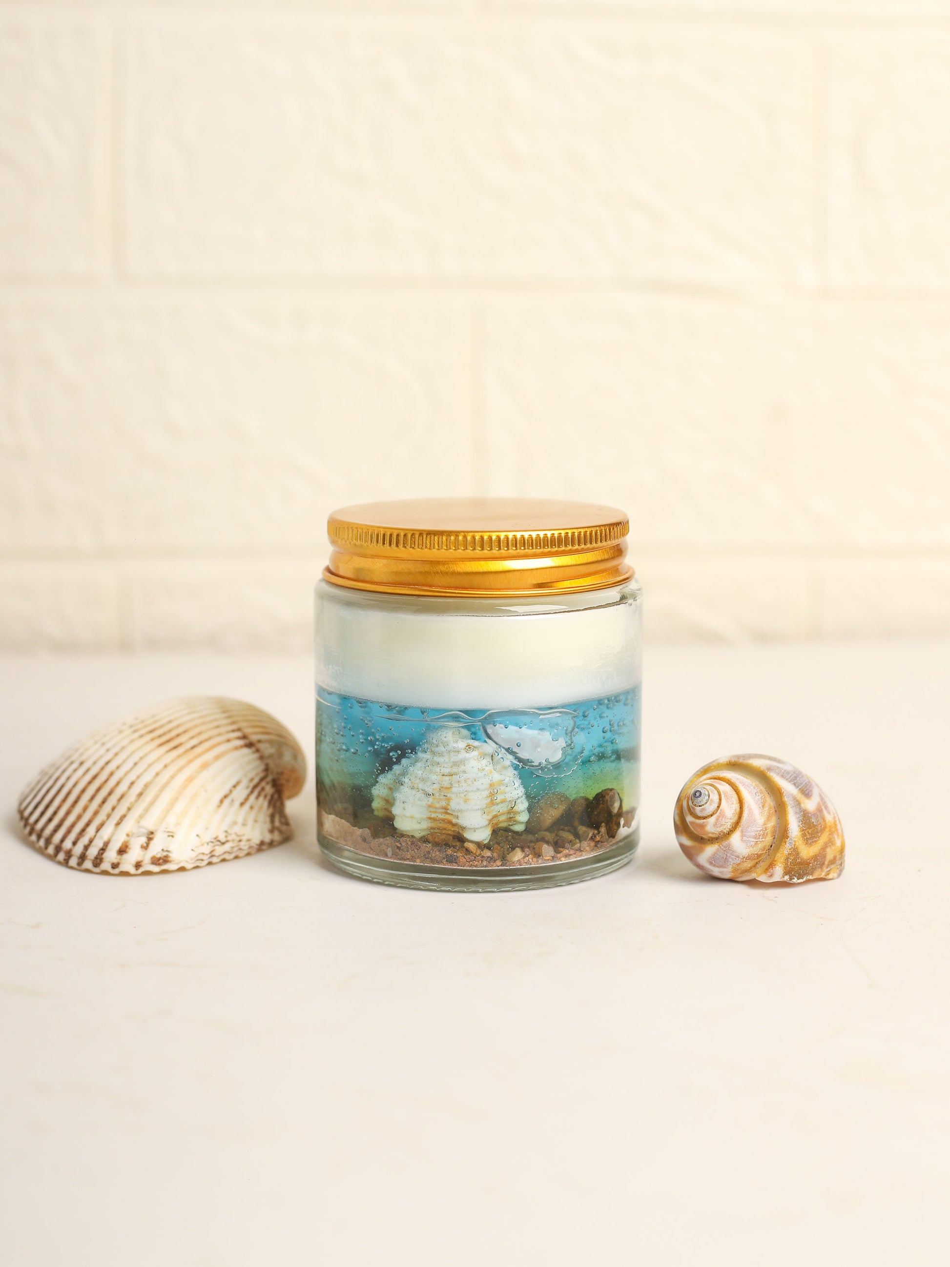 A coastal-inspired candle with layered sea tones and shells, designed to bring calm, warmth, and ocean memories into your space.