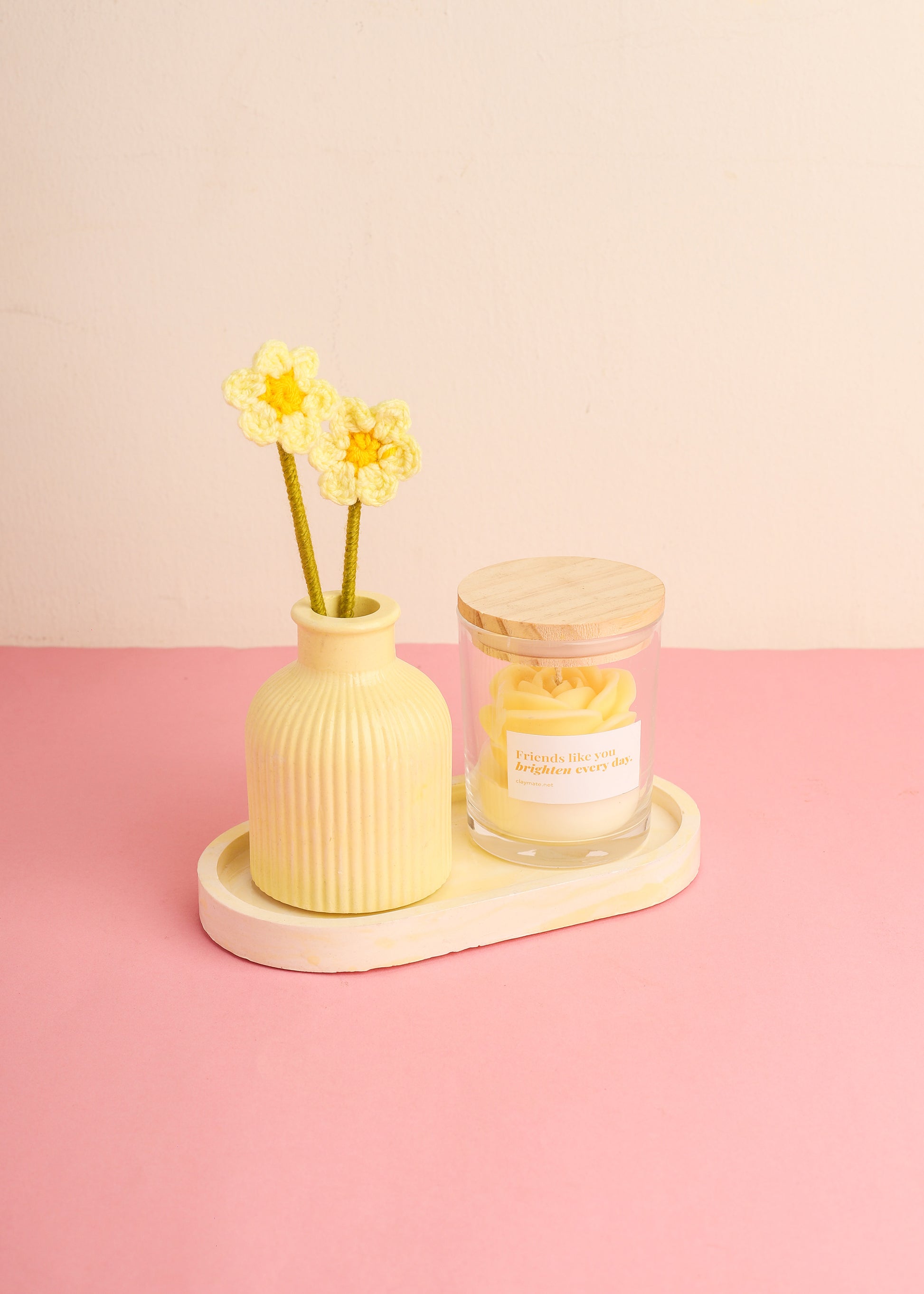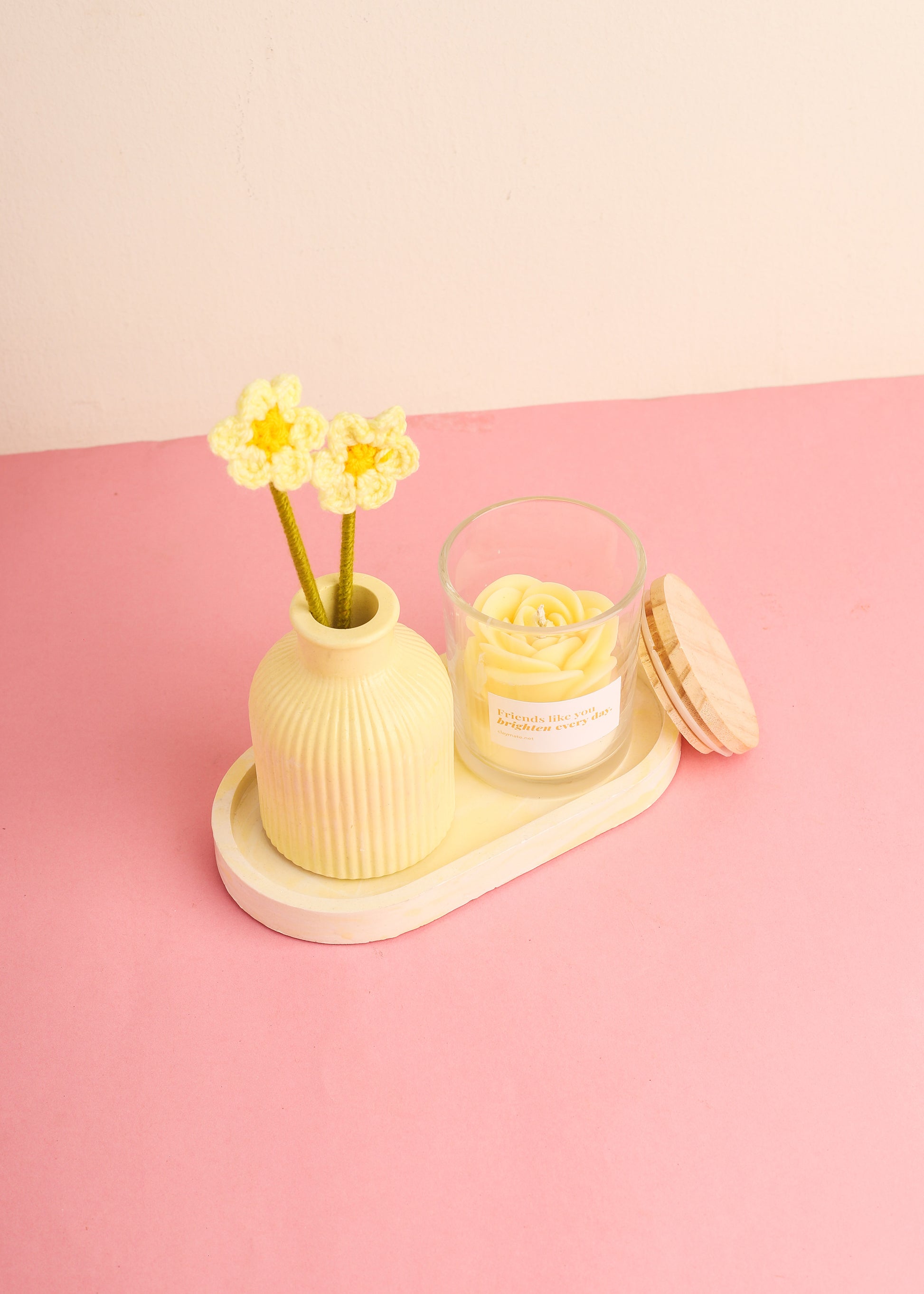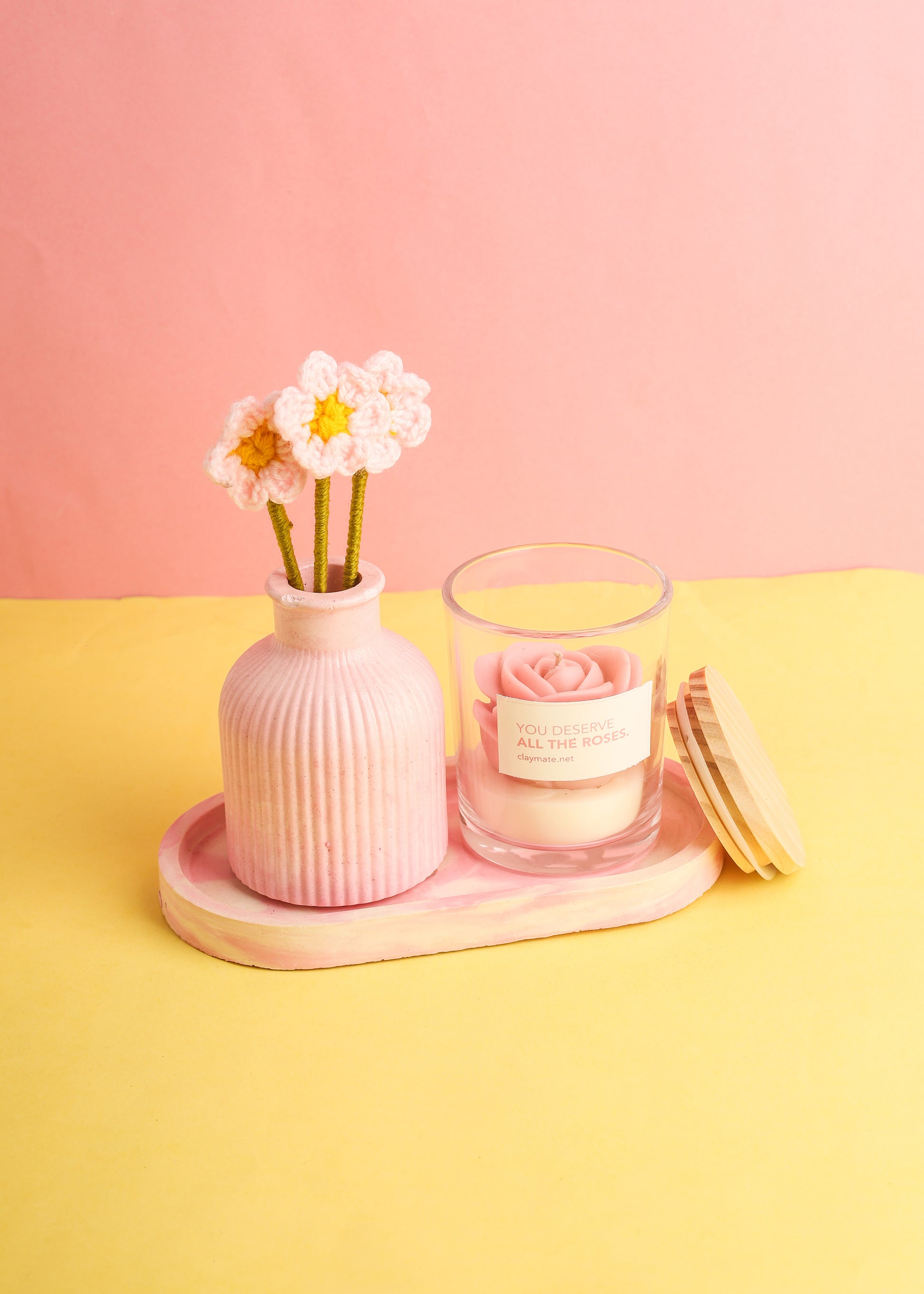 Our decor pieces (like trays and vases) are water-resistant but not fully sealed, so they’re best for dry use only. For vases, we recommend pairing them with our crochet flowers or pampas grass, not fresh florals.
